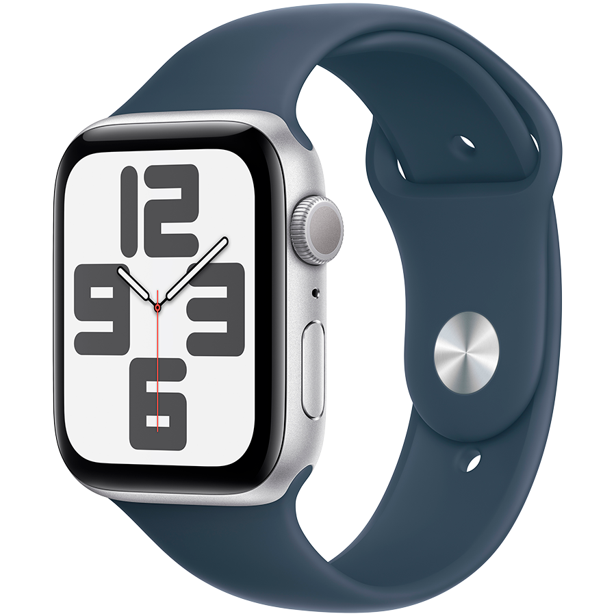Apple Watch SE2 v2 GPS 44mm Silver Alu Case with Storm Blue Sport Band – M/L