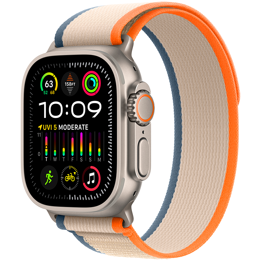 Apple Watch Ultra2 Cellular, 49mm Titanium Case w Orange/Beige Trail Loop – M/L