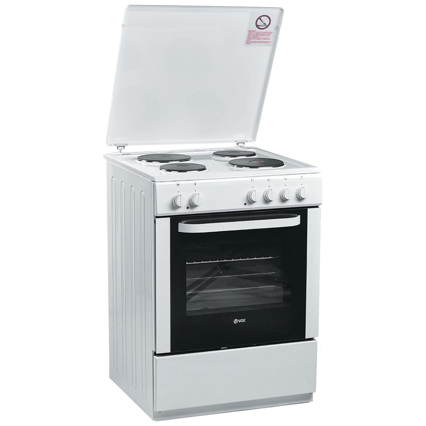 Štednjak 4 električne ringle, 4 zone kuhanja 2 x Ø 145 mm – 1000 W, Ø 180 mm – 1500 W, Ø 180 mm – 2000 W, zapremina pećnice 72 lit., gornji grijač 1200 W, donji grijač 1100 W, električni dupli grill grijač – 2600 W, svjetlosni indikatori, kromirana rešetka, lim za pećenje, poklopac, boja bijela