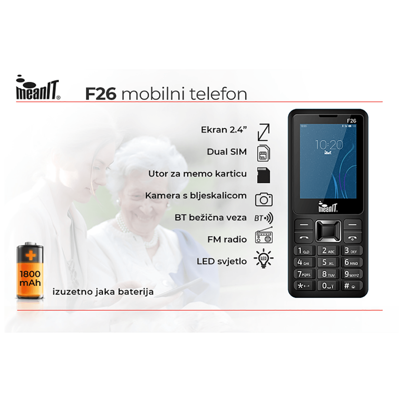 Mobilni telefon , 2.4” ( 6.1 cm ), zaslon u boji, Dual SIM, GSM 850/900/1800/1900 MHz, kamera sa bljeskalicom, Bluetooth, FM radio, LED svjetiljka, utor za microSD karticu, baterija 1850 mAh, crna boja