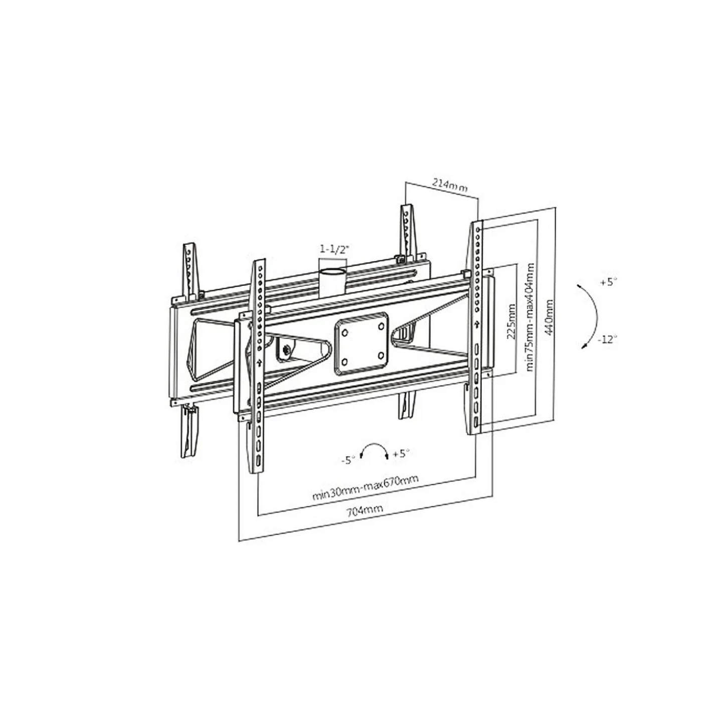 Nosač ima mogućnost nagiba (tilt) u rasponu od +5° do -12°, što omogućava prilagođavanje kutova gledanja u prostoru. Izrađen je od čvrstog metala sa završnom obradom prah-premazom u crnoj boji radi estetike i otpornosti.