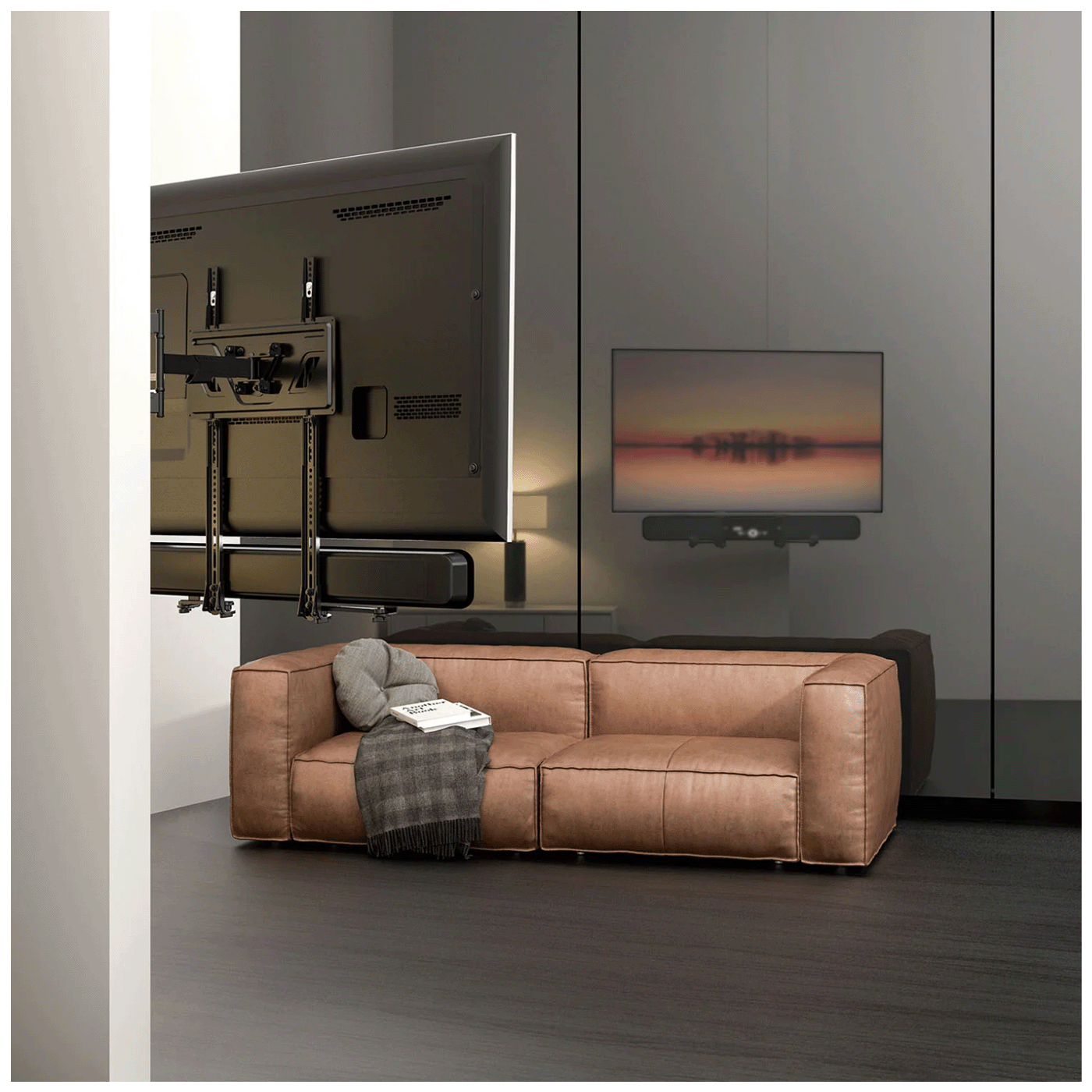 Montaža je jednostavna — nosač se može pričvrstiti na VESA nosač TV-a ili direktno na zid, ovisno o konfiguraciji koju imate. Držači su obloženi pjenastim slojem koji sprječava grebanje i vibracije. Uređaj također omogućava mali pomak prema naprijed/straže kako bi se postigao bolji zvuk i estetski sklad između televizora i soundbara.