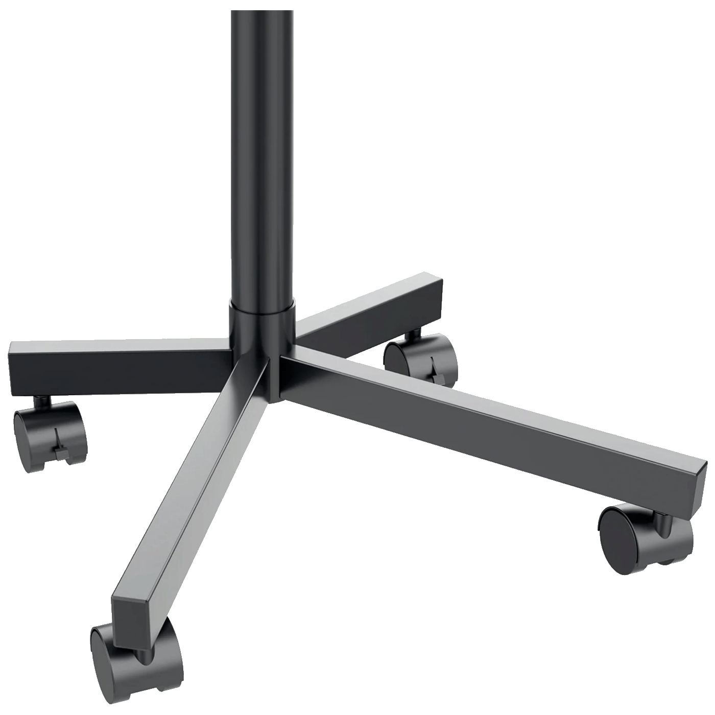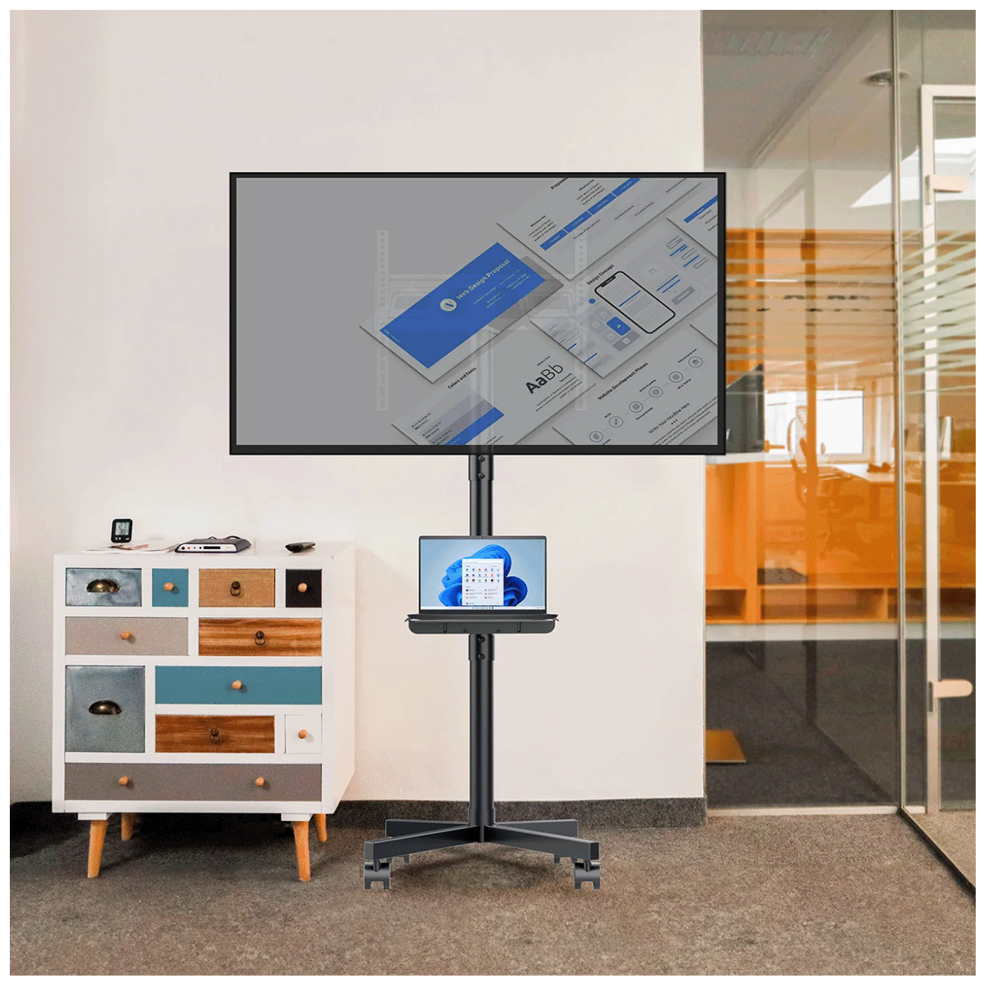 Ovaj stalak je opremljen stabilnom konstrukcijom s četiri kotača, što omogućava jednostavno pomicanje cijelog sustava bez potrebe za ponovnim montiranjem. Kotači imaju mehanizme za zaključavanje, pa se TV može sigurno fiksirati na mjestu kad je u upotrebi.