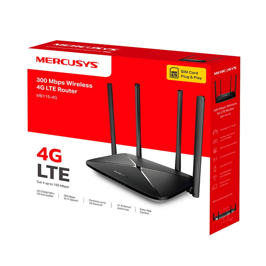ROUTER Mercusys MB115-4G 300 Mbps Wireless N 4G LTE, 300 Mbps at 2.4 GHz, 4G Cat4 150/50 Mbps, 4x Fixed External Antennas, 3x 10/100 Mbps LAN Ports, 1