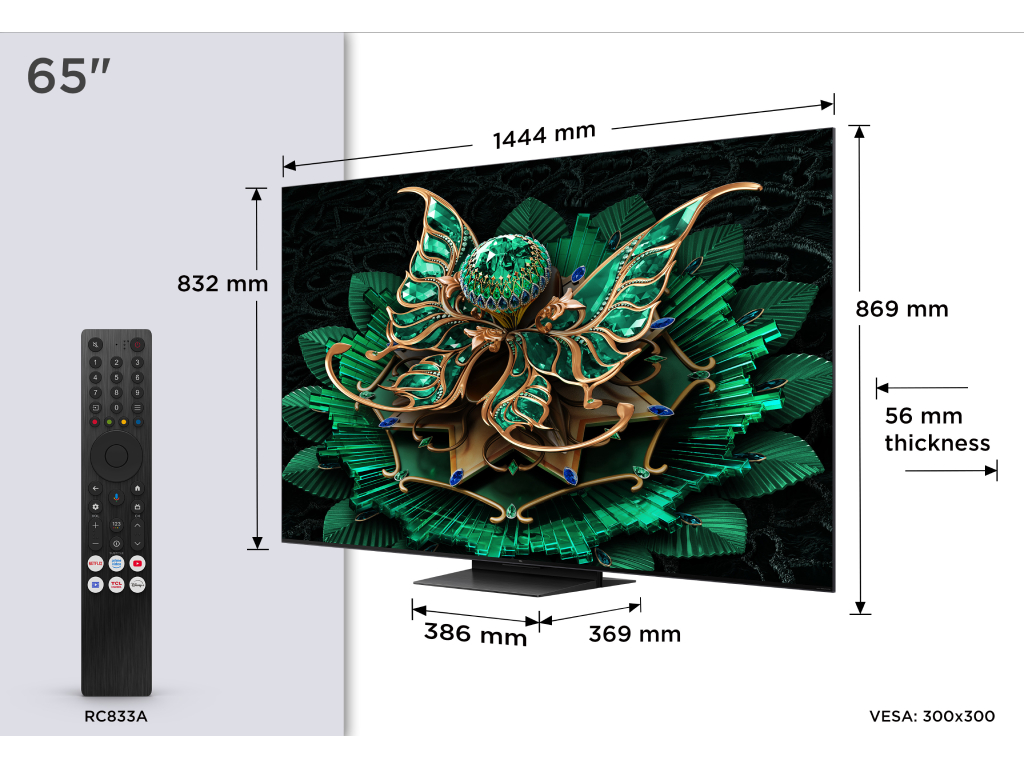 TCL 65”C7K 4K QD-Mini LED TV; 144Hz Google TV; Crystglow HVA Panel; Game Master; Audio Bang & Olufsen; HDR Premium; HDR10+ HDR10 HLG; Netflix Youtube Amazon Prime Apple TV; Chromecast & T-cast; HDMI: 4x 2.1; USB: 1x 3.0;